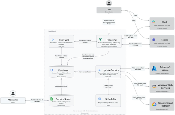 StackFeed 的前端架构采用混合渲染,将每个服务(最初来自 Google 表格的 JSON 数据)转换为用户友好的格式。StackFeed对提要和文章内容使用服务器端呈现(SSR),用户可以通过查询字符串传递服务以创建自定义提要。Netlify 函数上的Nitro处理部署,允许在边缘进行 SSR。