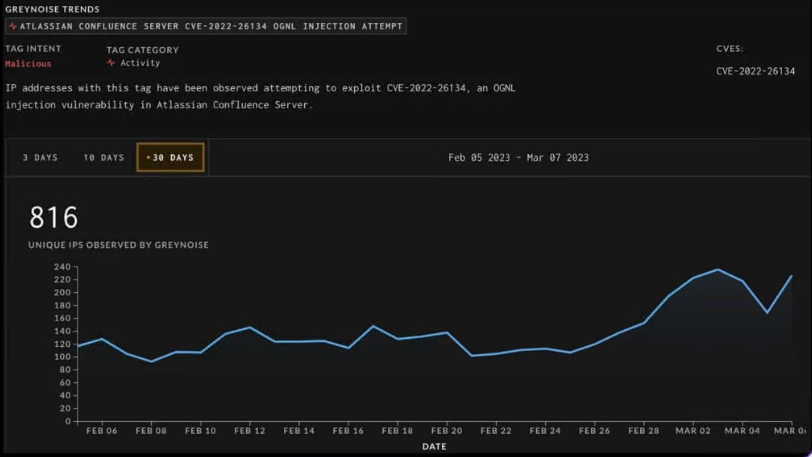 在漏洞利用次数最多的列表中位居榜首的是 CVE-2022-26134,在 GreyNoise 中有 1,421 个结果,过去一个月有 816 次利用尝试。