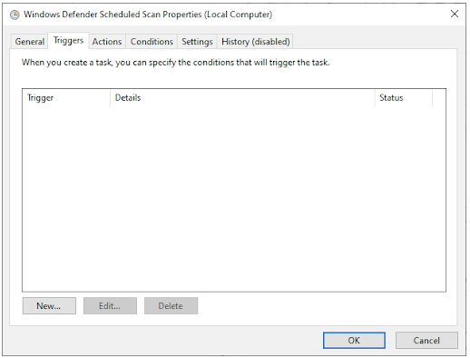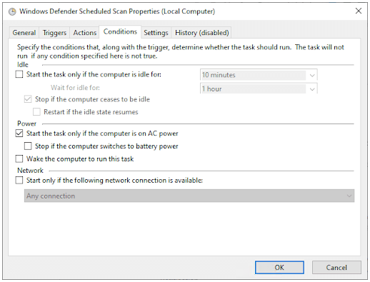 在新窗口中,转到条件选项卡,然后单击确定并取消选中所有选项。这将清除您 PC 上的计划扫描。