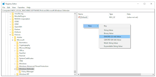 如果没有名为 DisableAntiSpyware 的注册表项,请返回注册表编辑器主窗格并右键单击它 > 选择新建> DWORD (32 位) 值。