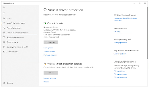 接下来,单击病毒和威胁防护> 然后在病毒和威胁防护设置上,单击管理设置。