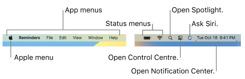 菜单栏沿着 Mac 上的屏幕顶部运行。 使用菜单栏中的菜单和图标来选择命令、执行任务和检查状态。