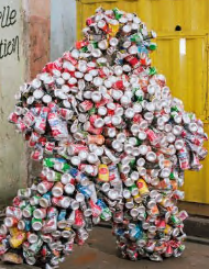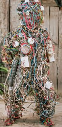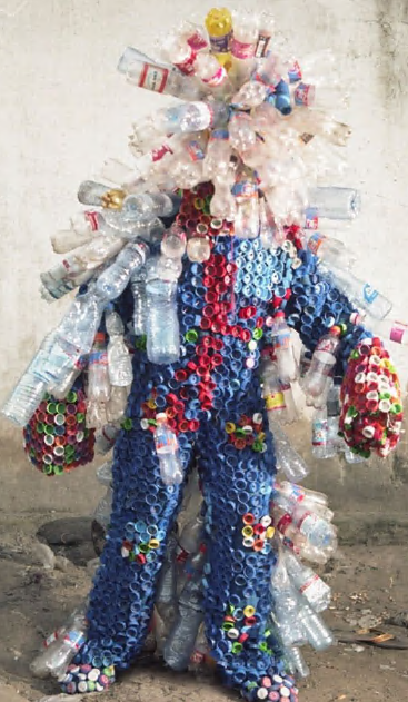 艺术家 Junior Mungongu 穿着由塑料瓶和盖子制成的服装。