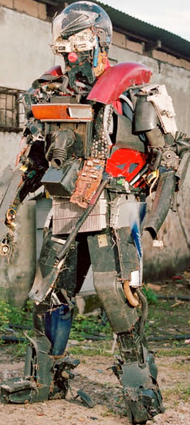 一位艺术家在一堆电线中摆姿势;另一个穿着完全由废弃手机制成的超现实机器人制服。