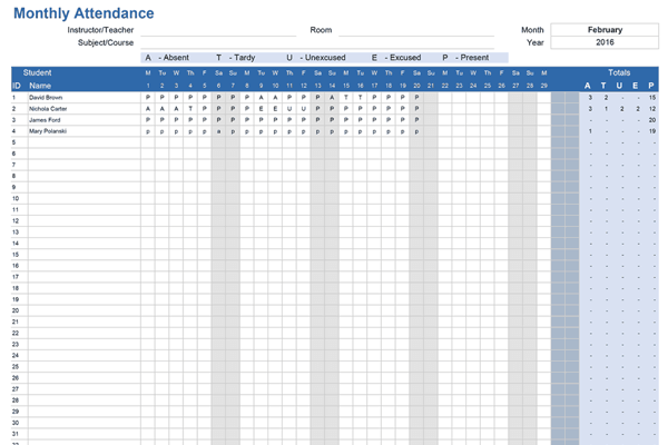 此月度出勤表模板允许您记录学生、工作人员或团队成员是否出席、缺席、迟到、无故迟到或原谅。