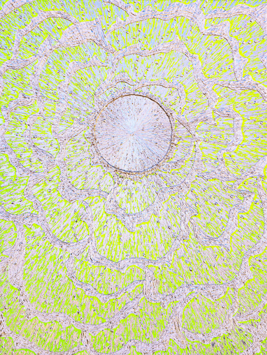 她的作品结合了辐射线和反复出现的螺旋线,引发了一种运动感并吸引了观众。强烈明亮的色彩光束像激光一样从画布的反射中心发出,就像灵感的闪电。从远处看,观众可以欣赏抽象星暴的活力,但走近一点,他们可以欣赏到显微镜下看起来像细胞的微小金属斑点。