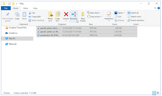单击重命名按钮。(提示:您也可以选择文件夹中的第一个文件,然后使用 F2 键进入重命名模式。)