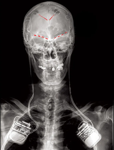 研究人员将记录电极(红线)和双向脑刺激和记录植入物植入四名患者体内,试图弄清导致他们慢性疼痛症状的原因。