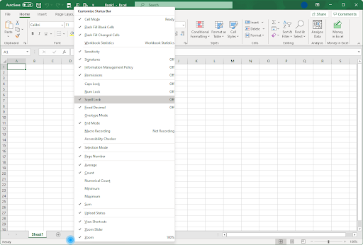 您还可以禁用 Excel 本身的 Scroll Lock 功能。这可以通过访问状态栏然后取消选择该选项来完成。