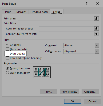 在 Windows 版本的 Excel 中,您可能会遇到在打印窗口中预览网格线的问题。这是由称为“草稿质量”的功能引起的。从本质上讲,它会降低质量以显示您的文档在纸上的外观的更快预览,这可能会导致网格线不出现。