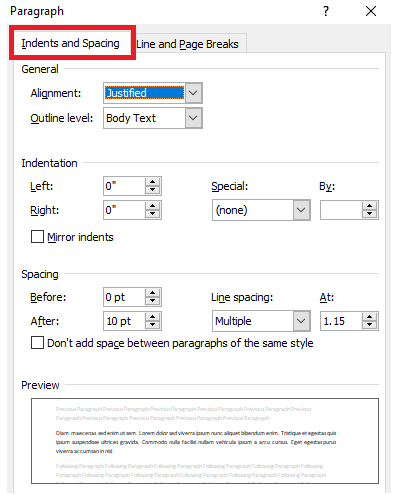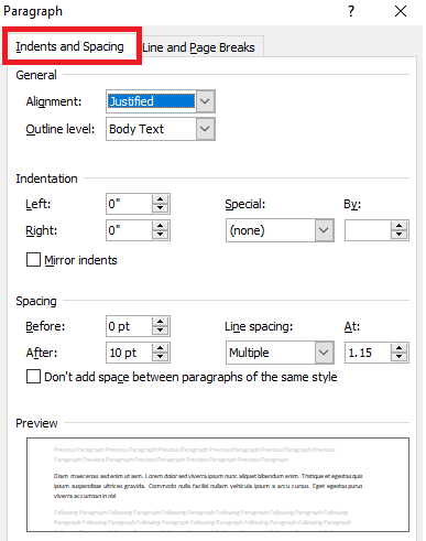单击段落对话框中的缩进和间距选项卡。