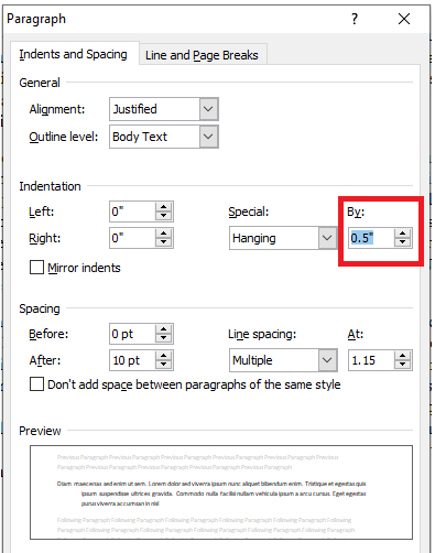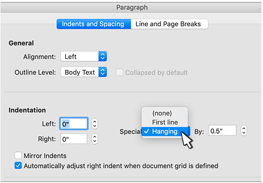 查找Indentation部分并从Special下拉列表中选择Hanging 。