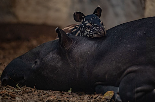 2022 年 11 月出生的马来貘幼崽 Nessa 将头靠在昏昏欲睡的母亲身上。该物种原产于东南亚,由于森林砍伐和狩猎而濒临灭绝。切斯特动物园表示,最近的出生将有助于确保马来貘的安全网种群,防止它们灭绝。