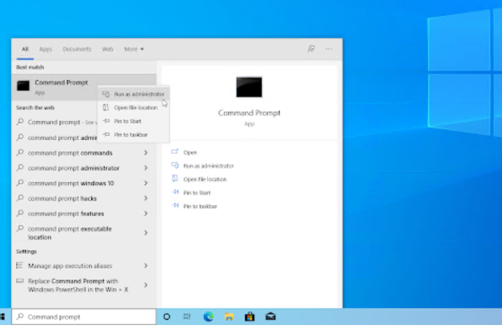 在搜索框中键入命令提示符。当您在结果中看到它时,右键单击它并选择Run as Administrator 。如果您使用的是没有管理员权限的本地帐户,请先单击此处。