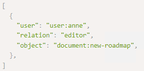 定义授权模型后,可以指定表示实体和对象之间关系的具体实例的关系元组。下面是一个基于先前文档共享用例的关系元组: