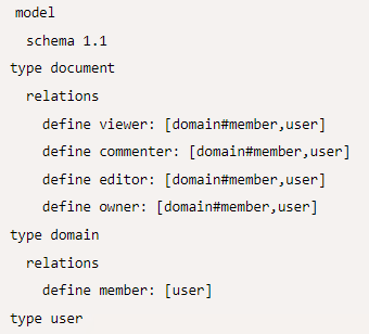 Zanzibar 设计的核心,因此也是 OpenFGA 设计的核心,是授权模型语言和关系元组。授权模型语言支持对域中的实体、可以应用权限的对象以及它们之间可能的关系进行灵活定义。下面显示了文档共享用例的示例: