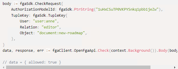 授权模型和关系元组可以通过其API或特定语言的 SDK添加到 OpenFGA 服务器。一旦这些就绪,应用程序就可以使用 Check API 来评估关系。下面显示了一个使用 Go SDK 的示例: