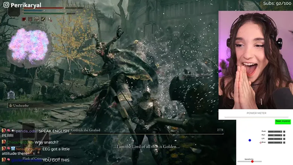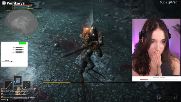 在这张来自她的 Twitch 直播的剧照中,Perri Karval 与游戏Elden Ring中的角色 Godrick 的士兵战斗。Karval 的心理可视化生成 EEG 信号,她的脑机接口软件读取这些信号,然后将其转化为虚拟 Xbox 控制器上的命令。