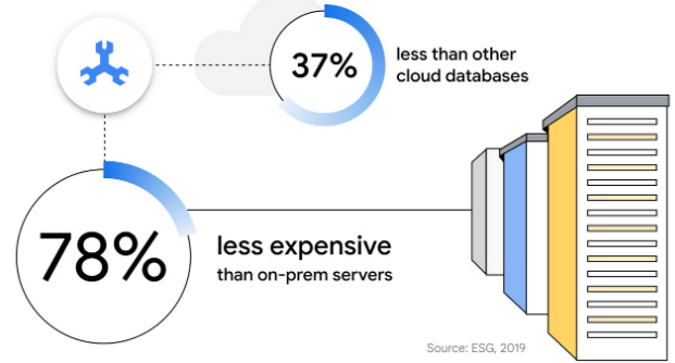一项关于 Cloud Spanner 经济效益的 ESG 研究得出结论,在 Cloud Spanner 上托管数据比使用本地服务器的成本低 78%,比使用其他云数据库的成本低 37% 。