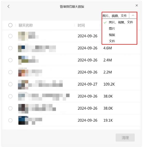 ③ 在这里就可以根据联系人和群来删除聊天记录了。也可以在右上角单独选择【图片】、【视频】、【文件】,查找不需要的资料挨个删除。
