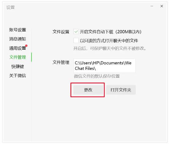 ① 打开电脑版微信,在左下角找到 【设置】 -- 【文件管理】 -- 【更改】;