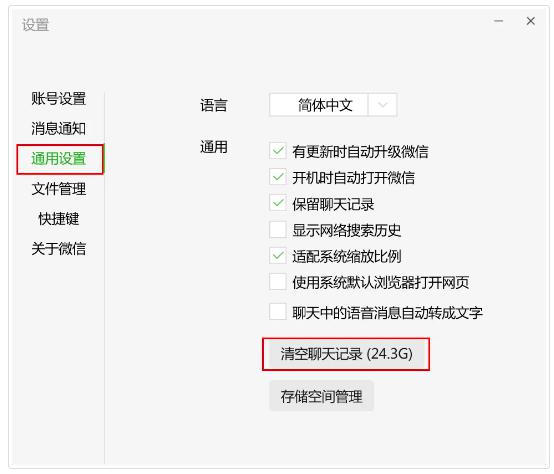 这是最简单粗暴的方式,如果你确定聊天记录和资料里没有重要的东西,或者已经在其他地方做好了备份,那么打开电脑版微信,在左下角找到 【设置】 --【通用设置】,直接点击【清空聊天记录】,一键搞定!