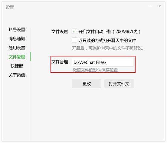 ② 将文件管理下的微信默认保存位置更改为其他磁盘下即可。