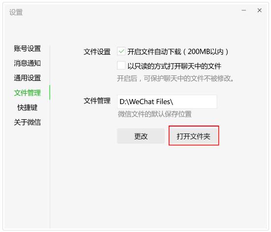 ① 打开电脑版微信,在左下角找到 “设置” -- “文件管理” -- “打开文件夹”