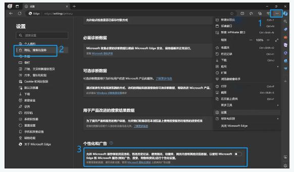 浏览器点击右侧三个点,选择设置-【隐私、搜索和服务】,下拉关闭【个性化和广告】