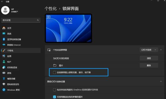 开始菜单设置,选择个性化-锁屏界面,个性化锁屏界面,选择【幻灯片放映】,取消勾选【在锁屏界面上获取花絮、提示、技巧等】