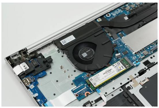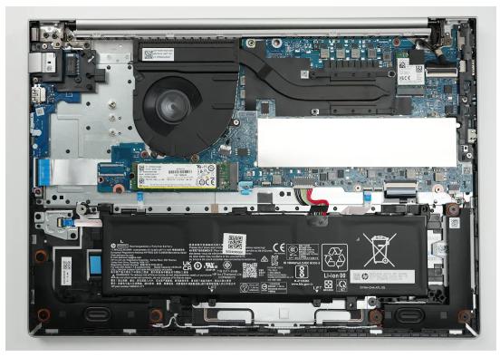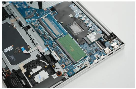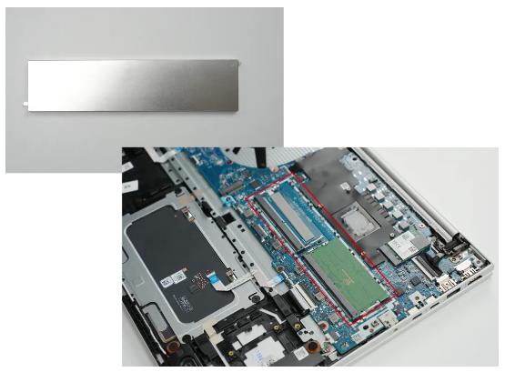 内存的上方设有金属屏蔽罩,具有电磁屏蔽、辅助散热以及保护硬件的作用。HP EliteBook 665 G11配有双内存插槽,能够支持高达64GB DDR5高速内存,满足多任务处理需求。