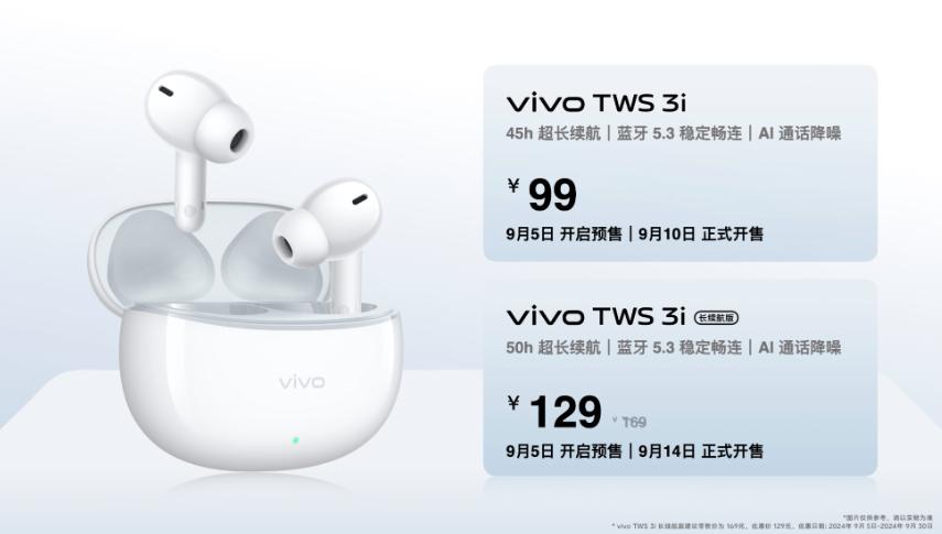一同发布的还有vivo TWS 3i耳机,售价99元起,首销还有优惠。作为一款真无线耳机,vivo TWS 3i总续航可以达到45h,长续航版本作为vivo最长续航耳机,更是达到50h超长续航;搭载蓝牙5.3,可支持多设备双连接;AI通话降噪搭配上10mm高解析声音单元和DeepX 3.0立体声效,尽享沉浸音质;同时具备IP54级防尘防水技术,让其可以适应更多使用环境,不论是在健身房还是户外跑步,都不会因汗水和雨水侵扰而担忧。9月10日,vivo TWS 3i标准版将正式开售,价格99元。长续航版也将于9月14日正式开售,首销期仅售129元。欢迎前往商品详情页了解更多细节。