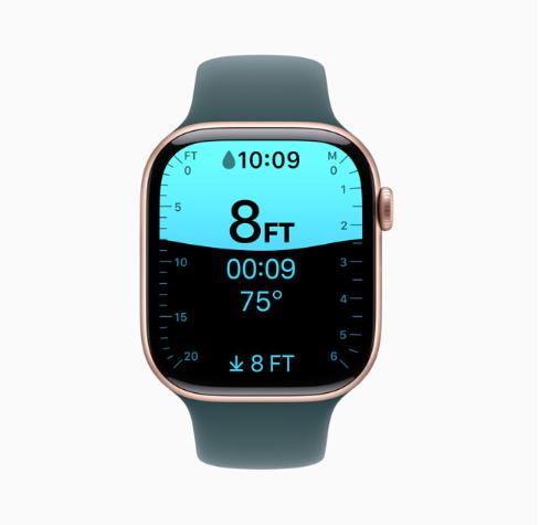 新深度计可测量水下最多 6 米的深度,非常适合浮潜和浅深度潜水,或者在水池、湖泊或海洋中玩耍。此外,新的水温感应器可在 Apple Watch 没入水中后立即测量水温。内置水深 app 可在水下清晰显示时间、当前深度、水温、水下持续时间和最大深度,用户可选择让 Apple Watch 在没入水中后自动打开水深 app。在用户进行泳池游泳和开放水域游泳体能训练时,体能训练指标中也会显示水温。