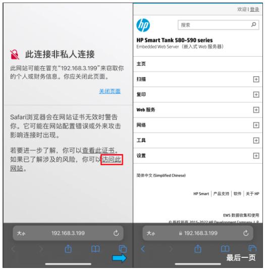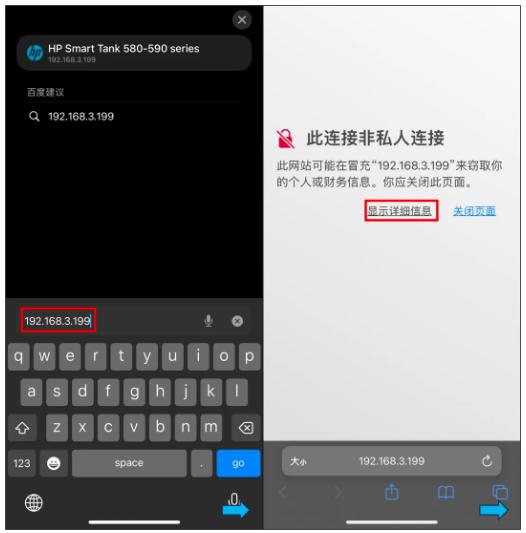 打开手机浏览器,网址栏内输入信息报告上的IP地址,点击访问,如提示安全信息,请点击【显示详细信息】- 【访问此网站】最后进入打印机后台网页