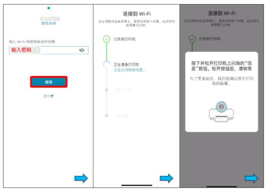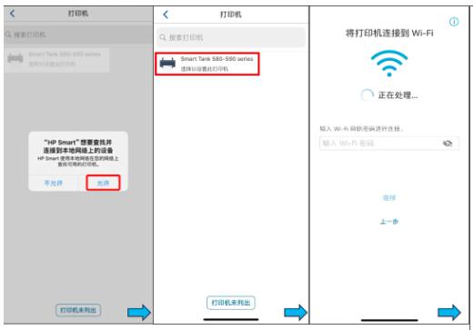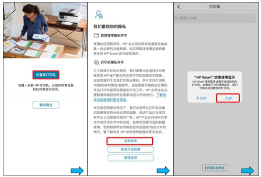 下载并打开HP Smart App,点击【设置新打印机】-【全部接受】- 【允许】- 【允许】-【选择打印机】- 【输入WiFi密码,按提示按下打印机面板闪烁的【信息键】