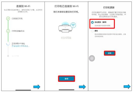 提示已连接到Wi-Fi - 点击【继续】,打印机更新页面请根据需求选择,点击【跳过打印页面】,至此无线配置完成