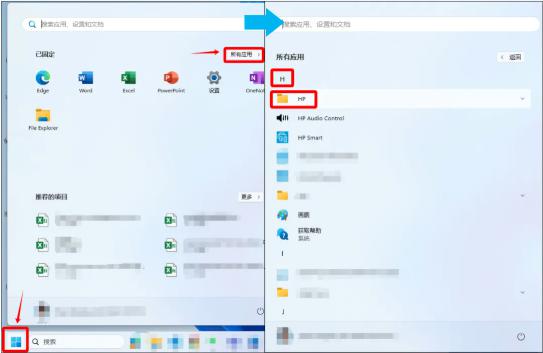 1)点击【开始】菜单,【所有应用】,找到【HP】文件夹,打开【HP MFP Scan】