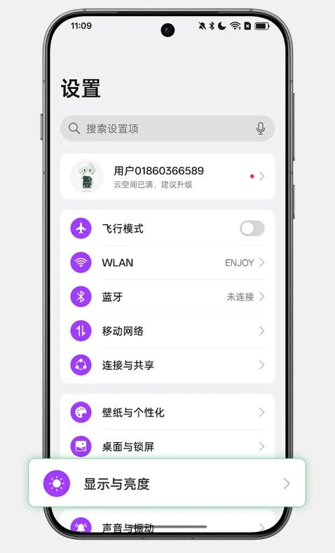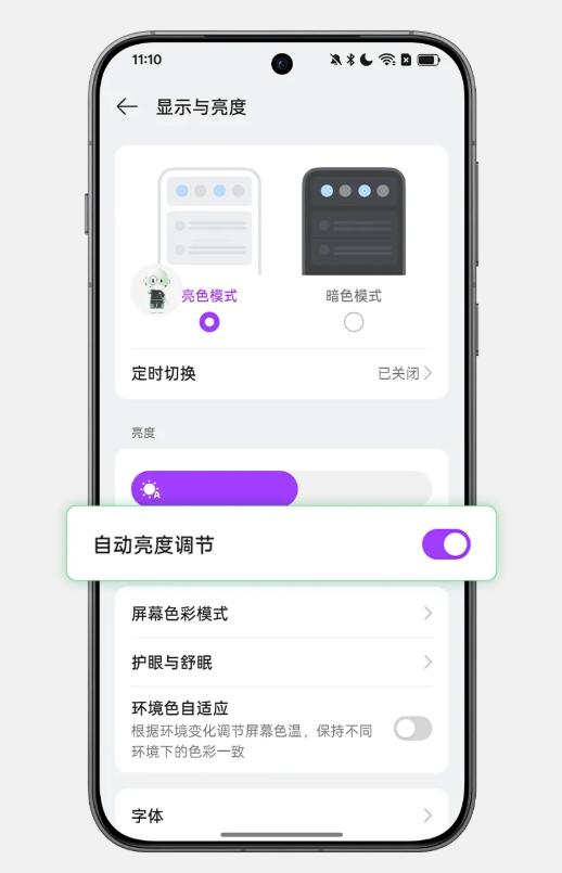 1、进入「设置>显示与亮度>开启屏幕亮度自动调节」,降低屏幕功耗;