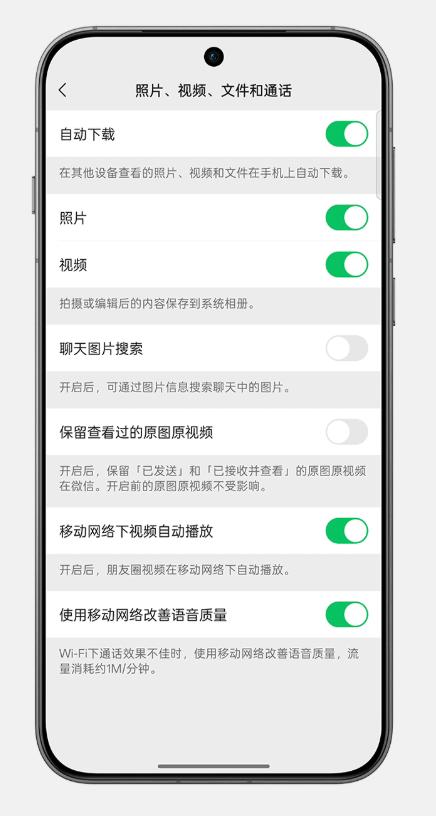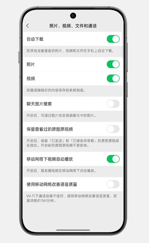 若是微信语音聊天时发热,你可以进入「微信>我>设置>通用>照片、视频、文件和通话>使用移动网络改善语音质量」,关闭该选项,缓解手机发热。