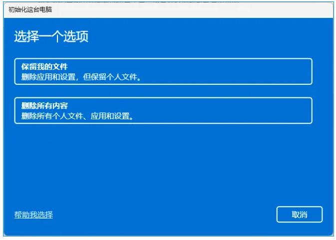 ③ 这时就会弹出【选择一个选项】操作界面,在这里可以选择【保留我的文件】或【删除所有内容】根据自己的需求来进行选择。