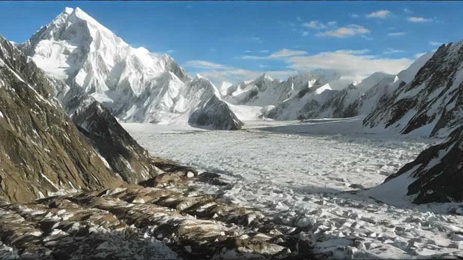 乔戈里峰呈金字塔形,冰崖壁立险峻地形复杂。山峰顶部是一个由北向南微微升起的冰坡面积较大。北侧如同刀削斧劈,平均坡度达45°以上。冰川表面破碎,明暗冰裂缝纵横交错。乔戈里峰两侧,长达44公里的音苏盖提冰川。